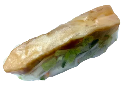 A teriyaki chicken rice paper roll is a type of Vietnamese spring roll that is made with thin, translucent rice paper wrappers and filled with various ingredients. The teriyaki chicken rice paper roll has pieces of chicken that are cooked with a sweet and savory sauce, along with fresh mint leaves, lettuce, shredded carrot, bean sprouts and rice vermicelli noodles. The roll is usually served cold temperature, and can be dipped in a sweet chilli sauce that comes in a small sachet. The teriyaki chicken rice paper roll is a flavorful and hearty snack or appetizer that has a Japanese twist.