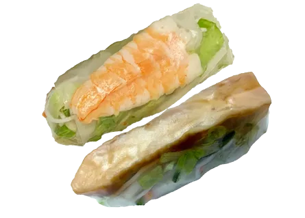 A combination rice paper roll is a type of Vietnamese spring roll that is made with thin, translucent rice paper wrappers and filled with various ingredients. The combination rice paper roll has two different kinds of fillings: one is teriyaki chicken, which is chicken cooked with a sweet and savory sauce made from soy sauce, sugar, mirin, and sake, and the other one is cooked prawn, which is a type of shrimp that has a firm and juicy texture. Both fillings are accompanied by fresh mint leaves, lettuce, shredded carrot, bean sprouts and rice vermicelli noodles. The roll is usually served cold or at room temperature, and can be dipped in a sweet chilli sauce that comes in a small sachet. The combination rice paper roll is a diverse and delicious snack or appetizer that offers a variety of tastes and textures.