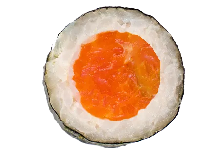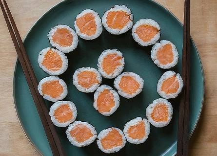 Fresh salmon hosomaki(mini roll) is a type of sushi roll that has a thin layer of seaweed wrapped around rice and fresh salmon fillet. The roll is cut into small pieces and served with a soy sauce sachet for dipping. The fresh salmon adds a tender texture and a rich flavor to the sushi. Fresh salmon hosomaki is a healthy option that can be enjoyed as a snack or a light meal. This item is now available exclusively as part of our Hosomaki Platter.