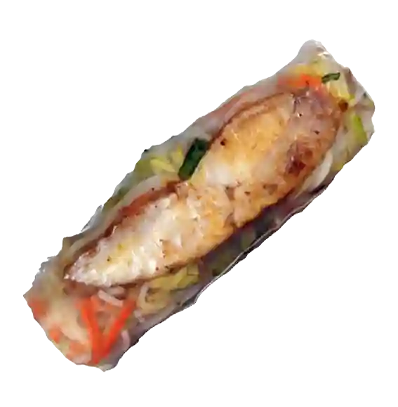 A teriyaki chicken rice paper roll is a type of Vietnamese spring roll that is made with thin, translucent rice paper wrappers and filled with various ingredients. The teriyaki chicken rice paper roll has pieces of chicken that are cooked with a sweet and savory sauce, along with fresh mint leaves, lettuce, shredded carrot, bean sprouts and rice vermicelli noodles. The roll is usually served cold temperature, and can be dipped in a sweet chilli sauce that comes in a small sachet. The teriyaki chicken rice paper roll is a flavorful and hearty snack or appetizer that has a Japanese twist.